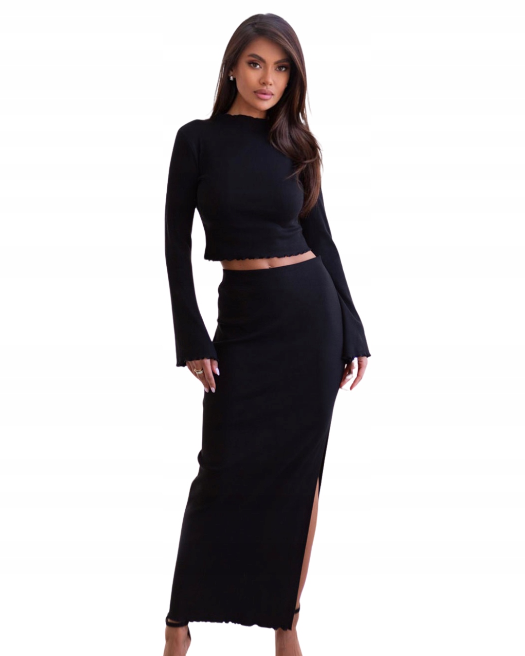 KOMPLET TOP I SPÓDNICA MIDI Z ROZCIĘCIEM NA NOGĘ ZESTAW BLUZKA CZARNY M