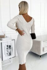 Sweterkowa wygodna sukienka z dekoltem w serek – BEŻOWAROZMIAR : UNIWERSALNY